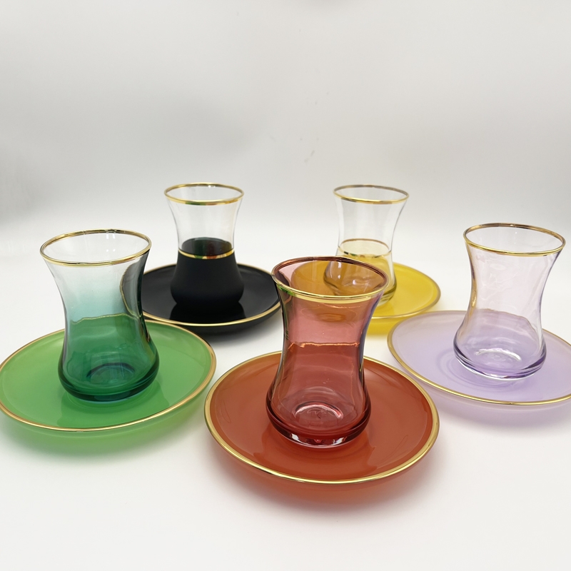 our custom-made gourd-shaped cup and saucer set has gold rim and colorful body. The cup has a capacity of 135ml and features a unique gourd shape, inspired by Middle Eastern style.